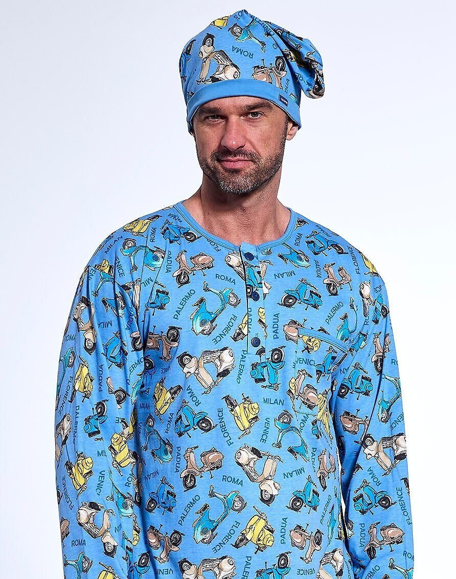 Koszula nocna, męska- wysokiej jakości bawełna- ozdobny kolorowy print- długi rękaw- dekolt zapinany na guziki- na piersi naszyta mała kieszonka- do kompletu szlafmycaSkład: 100% bawełna przeczytaj całość