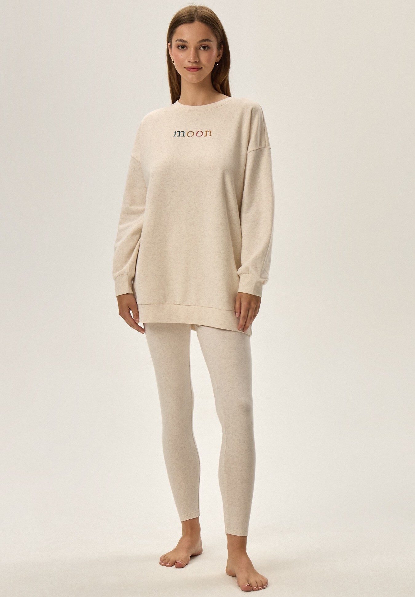 Homewear/dres damski z bawełny- dłuższa bluza o luźnym kroju, ocieplana od środka- z długim rękawem - okrągły dekolt- przód zdobi subtelny napis- rękawy oraz duł bluzy zakończone ściągaczem- spodnie długie, typu legginsy- dopasowaneSkład: bluza 70% bawełna, 30% poliester; legginsy 77% bawełna,... przeczytaj całość