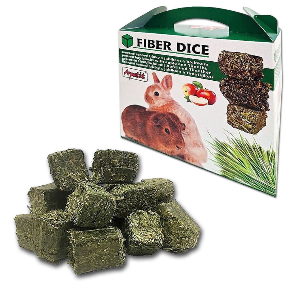 Karma uzupełniająca Apetit Fiber Dice jest idealna dla królików karłowatych, świnek morskich i innych gatunków gryzoni. Kostki z suszonego siana timothy wzbogacone o jabłko i lucernę dostarczają dużą zawartość błonnika, który wspiera zdrowe trawienie i naturalne ścieranie zębów. Dzięki delikatnemu suszeniu ciepłym powietrzem kostki są bezpyłowe i bez ryzyka pleśni.
