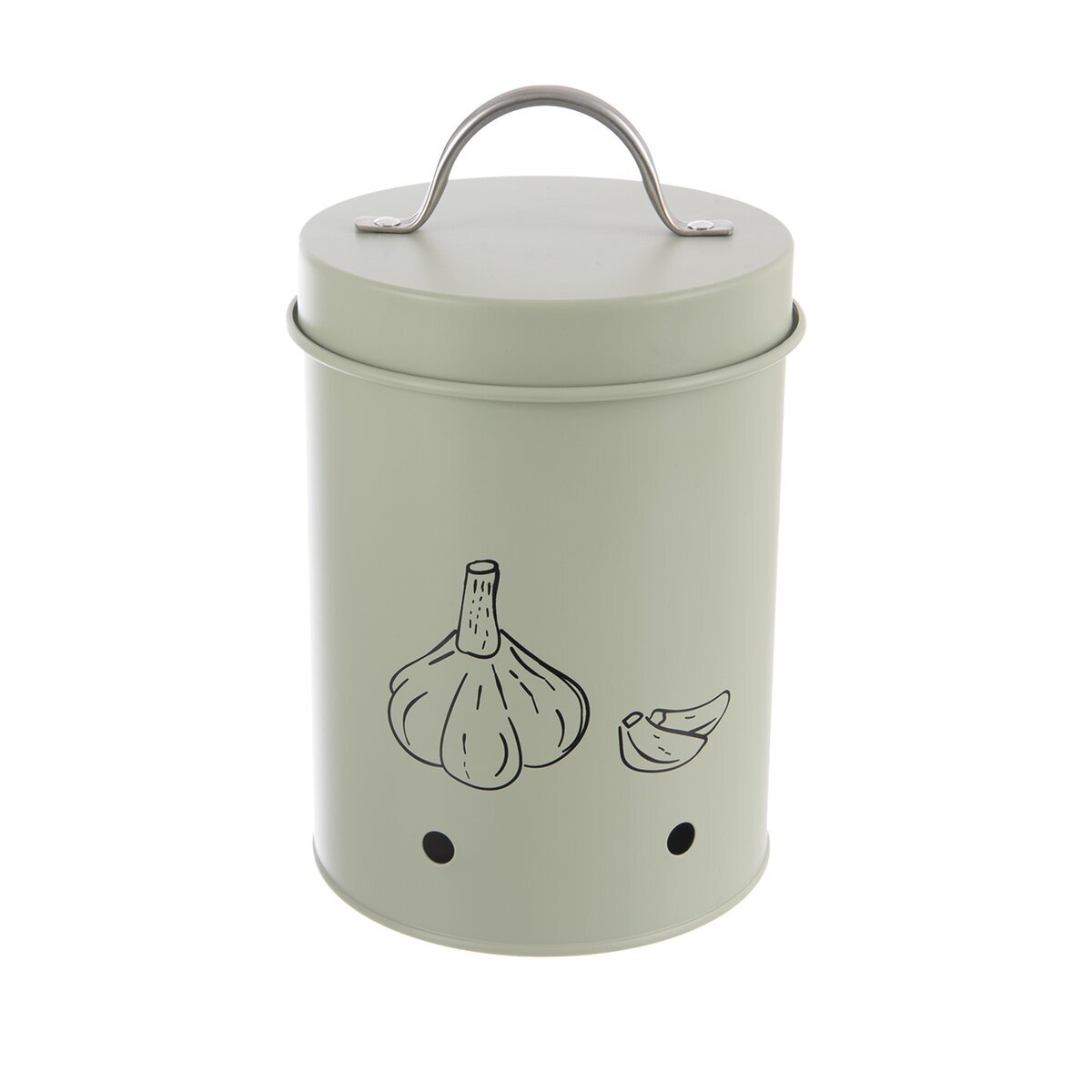Pojemnik z pokrywką do przechowywania czosnku jest odpowiedni dla gospodarstw domowych bez spiżarni czy piwnicy. Dzięki stylowemu designowi czosnek może być przechowywany bezpośrednio w kuchni, w widocznym miejscu, i stanowić ładną dekorację. Jednocześnie pełni praktyczną funkcję przechowywania żywności. Otwory wentylacyjne zapewniają cyrkulację powietrza, zapobiegają gromadzeniu się wilgoci i ciepła, co przeciwdziała kiełkowaniu, powstawaniu pleśni i zapewnia dłuższą trwałość. Materiał: blacha. Wymiary: śr. 11 cm, wys. 18,5 cm. Nie nadaje się do zmywarki, pojemnik można szybko i łatwo wyczyścić wilgotną ściereczką.