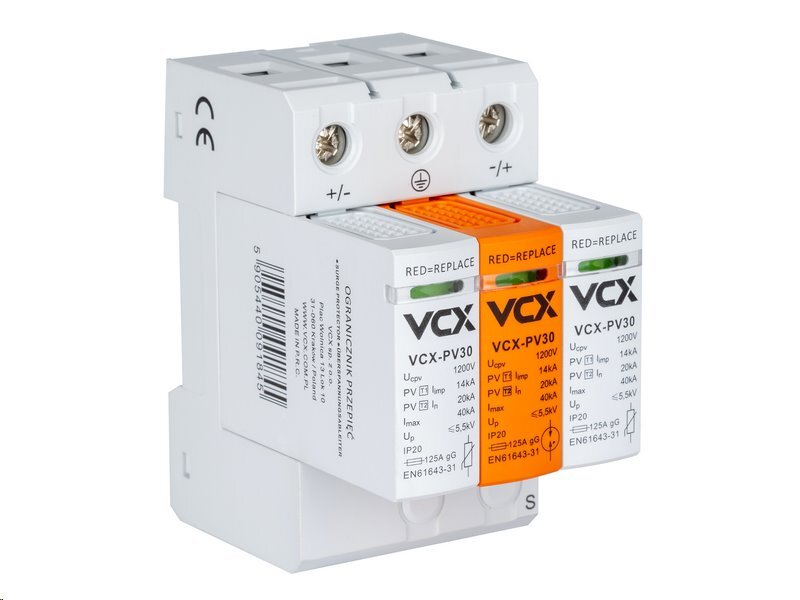 Přepěťová ochrana VCX DC T1+T2 (B+C) 3P 1200V 14kA je špičkové řešení pro ochranu fotovoltaických systémů proti přepětí způsobenému bouřkami nebo jinými přepěťovými jevy. Díky kombinované ochraně třídy B a C (T1+T2) je ideální pro první i druhý stupeň ochrany, čímž zajišťuje maximální bezpečnost celého systému.