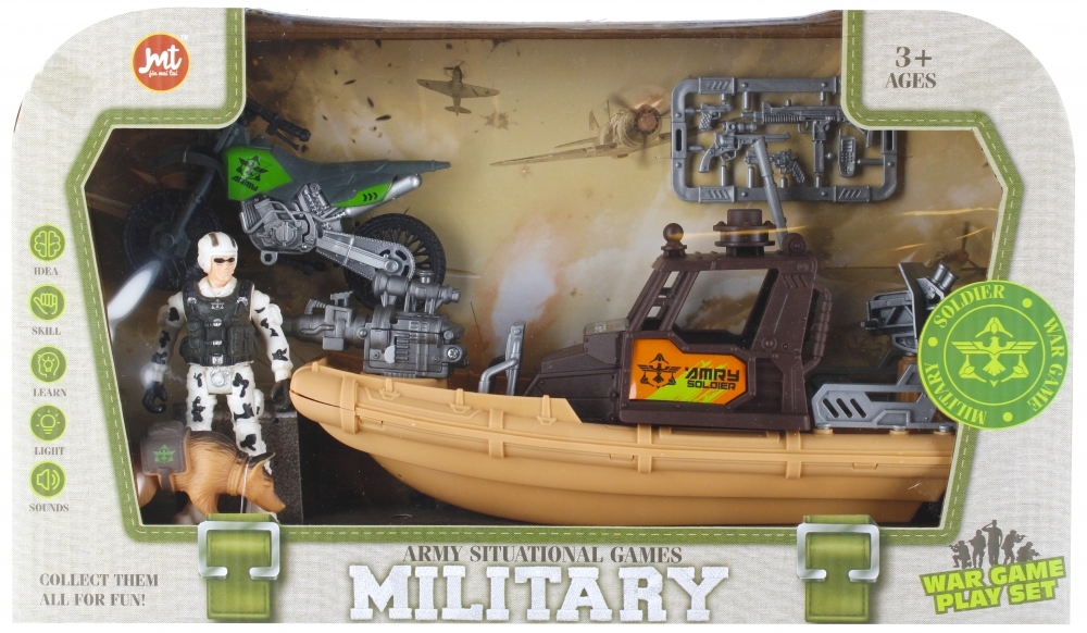 Zalety produktu: posiada ruchome elementy, posiada efekty dźwiękowe oraz świetlne. Wojskowa łódka do działań specjalnych od MEGA CREATIVE Zawsze gotowa do działania na wypadek wybuchu wojny Zawartość zestawu: łódka wojskowa, motor, figurka żołnierza, figurka psa, akcesoria wojskowe....
