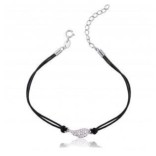 Textilní náramek dekorovaný přívěškem ve tvaru andělského křídla, které je vyrobeno z rhodiovaného stříbra 925/1000 a je zdobeno kubickými zirkony čiré barvy.Délka náramku je 16 cm + 3 cm prodloužení. Náramek ani komponenty komponenty neobsahují nikl, náramek je tedy vhodný i pro alergiky.Šperk...