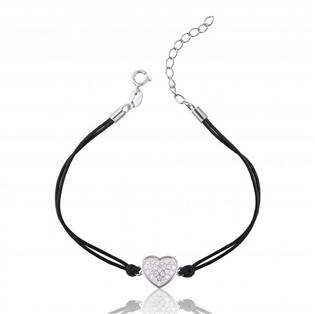 Textilní náramek dekorovaný přívěškem ve tvaru srdíčka, který je vyroben z rhodiovaného stříbra 925/1000 a je zdoben kubickými zirkony čiré barvy.