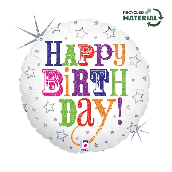 Jemný a zároveň výrazný – takový je tento kulatý fóliový balonek s barevným nápisem HAPPY BIRTHDAY, který září na bílém pozadí spolu s holografickými hvězdami. Skvěle se hodí k oslavám pro děti i dospělé, k moderním i veselým barevným aranžím.Balonek je vyrobený z holografické fólie a díky své...