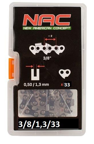 Vlastníte motorovou pilu NAC PHCBE90-CH a chcete si ještě více usnadnit práci se dřevem? Pořiďte si k ní 33článkový 3/8" pilový řetěz od značky NAC. Je vyrobený z kvalitních materiálů pomocí inovovaných technologií. Díky tomu je velmi odolný vůči ztupení a roztažení a má nízký zpětný ráz.