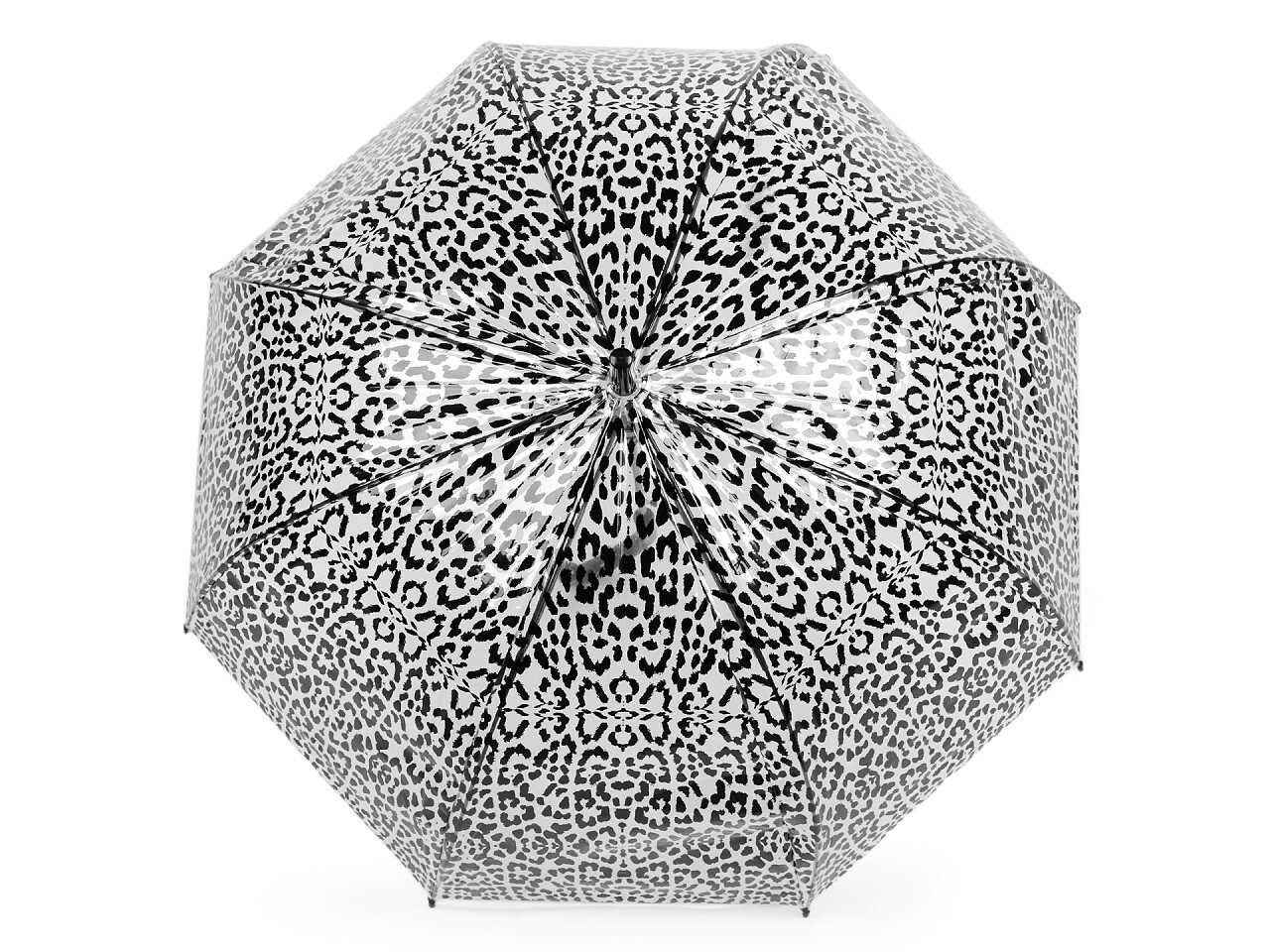 Průhledný deštník s barevným leopardím potiskem je ideální volbou pro všechny, kteří chtějí být styloví i za deštivého počasí. Je vystřelovací, určitě oceníte jeho velkou hloubku. Konstrukce deštníku je z kovového drátu a pružných lamel, tvoří osm polí. Díky nim je velice pevný, neohne se ani za největšího nečasu. Klasická tyč je zakončená pevnou rukojetí.