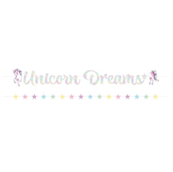 Vneste do své unicorn party trochu kouzla s touto krásnou závěsnou girlandou. Skládá se ze dvou částí: první je nápis „Unicorn Dreams“ s duhovým leskem a dvěma výseky jednorožců na krajích, druhá tvoří řetěz z pastelově barevných hvězdiček. Ideální jako dekorace na stěnu, za candy bar, ke vchodu...
