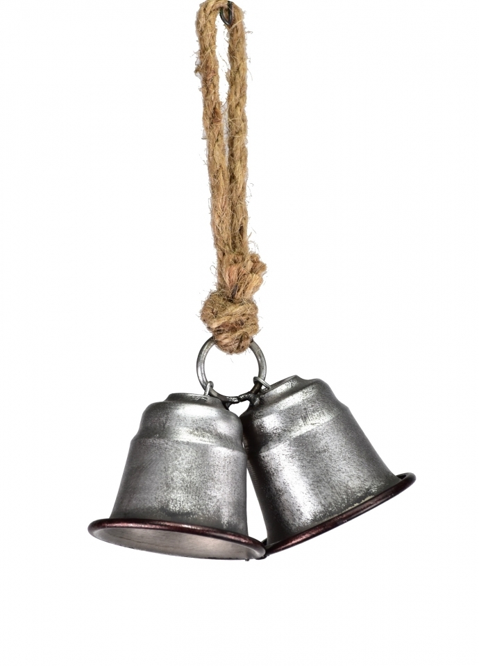 Dvojitý kovový zvonek stříbrný na jutovém provaze 14x12x25 cm
