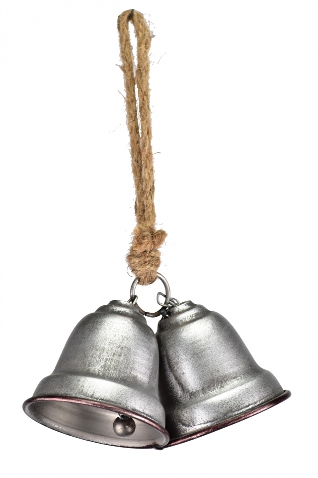 Dvojitý kovový zvonek stříbrný na jutovém provaze 9x16x25 cm