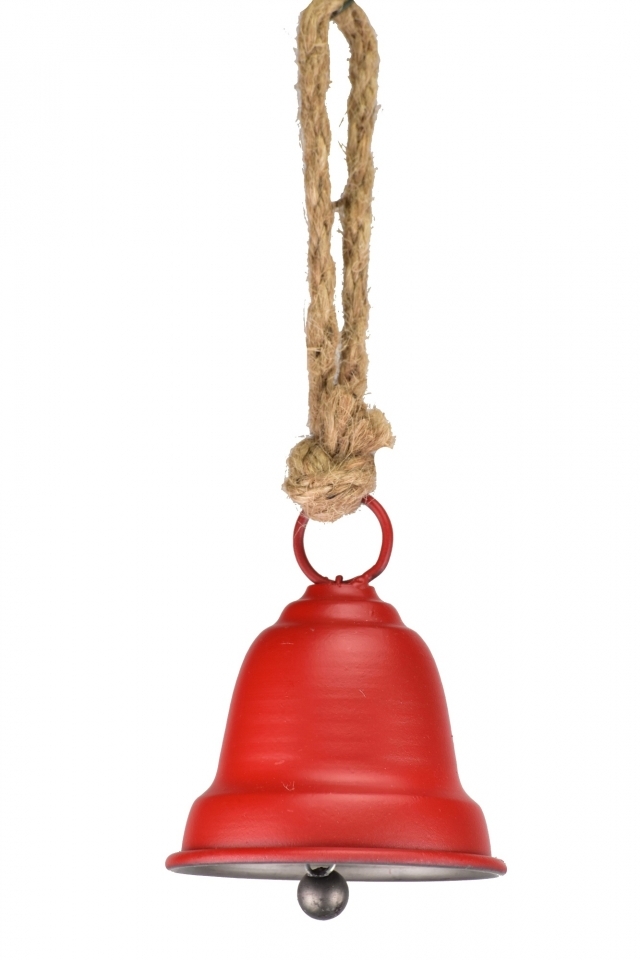 Kovový zvonek červený na jutovém provaze 9x7,7x25 cm