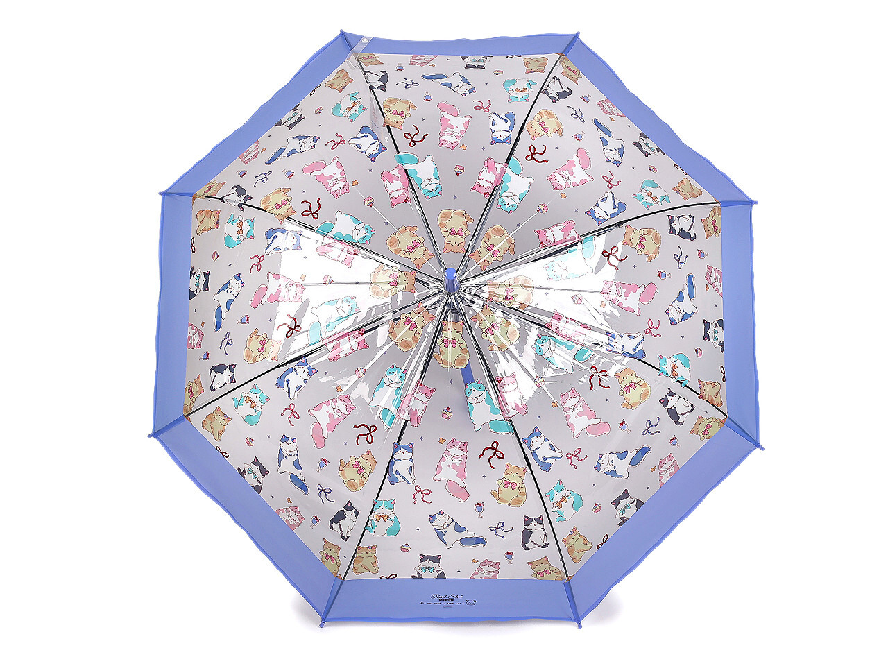 Průhledný deštník s barevným potiskem koček je ideální volbou pro všechny milovnice hravých módních doplňků. Je vystřelovací, okraj má ozdobený širokým barevným lemem. Konstrukce deštníku je z kovového drátu a pružných lamel, tvoří osm polí. Díky nim je velice pevný, neohne se ani za největšího nečasu. Klasická tyč je zakončená pevnou rukojetí.