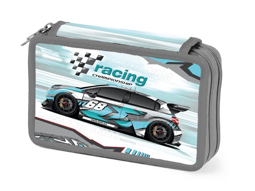 Szkolny dwupoziomowy niewyposażony piórnik z obrazkiem wyścigowego samochodu. Piórnik zawiera 24 pętelki na przybory do pisania oraz 3 większe np. na linijkę, temperówkę, gumkę lub nożyczki. Zamyka się na zamek błyskawiczny i jest wykonany z wysokiej jakości, trwałych materiałów. Niewątpliwie jest niezbędnym elementem wyposażenia każdego ucznia.