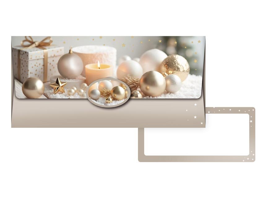 Luxusní obálka na peníze ve zlatobílém svátečním styluTato elegantní obálka na peníze vnese do vašeho dárku noblesu a slavnostní atmosféru. Kombinace zlatých a perleťových ozdob, jemné světlo svíčky a decentní pozadí vytvářejí harmonický motiv plný klidu, tepla a očekávání. Obálka je ideální pro...
