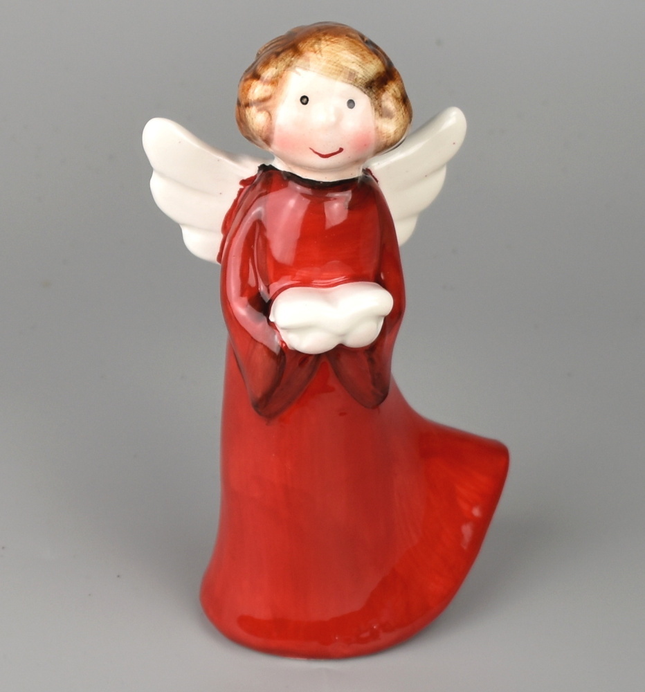 Anděl keramický s knihou v rukou. Barva červeno-bílá. przeczytaj całość