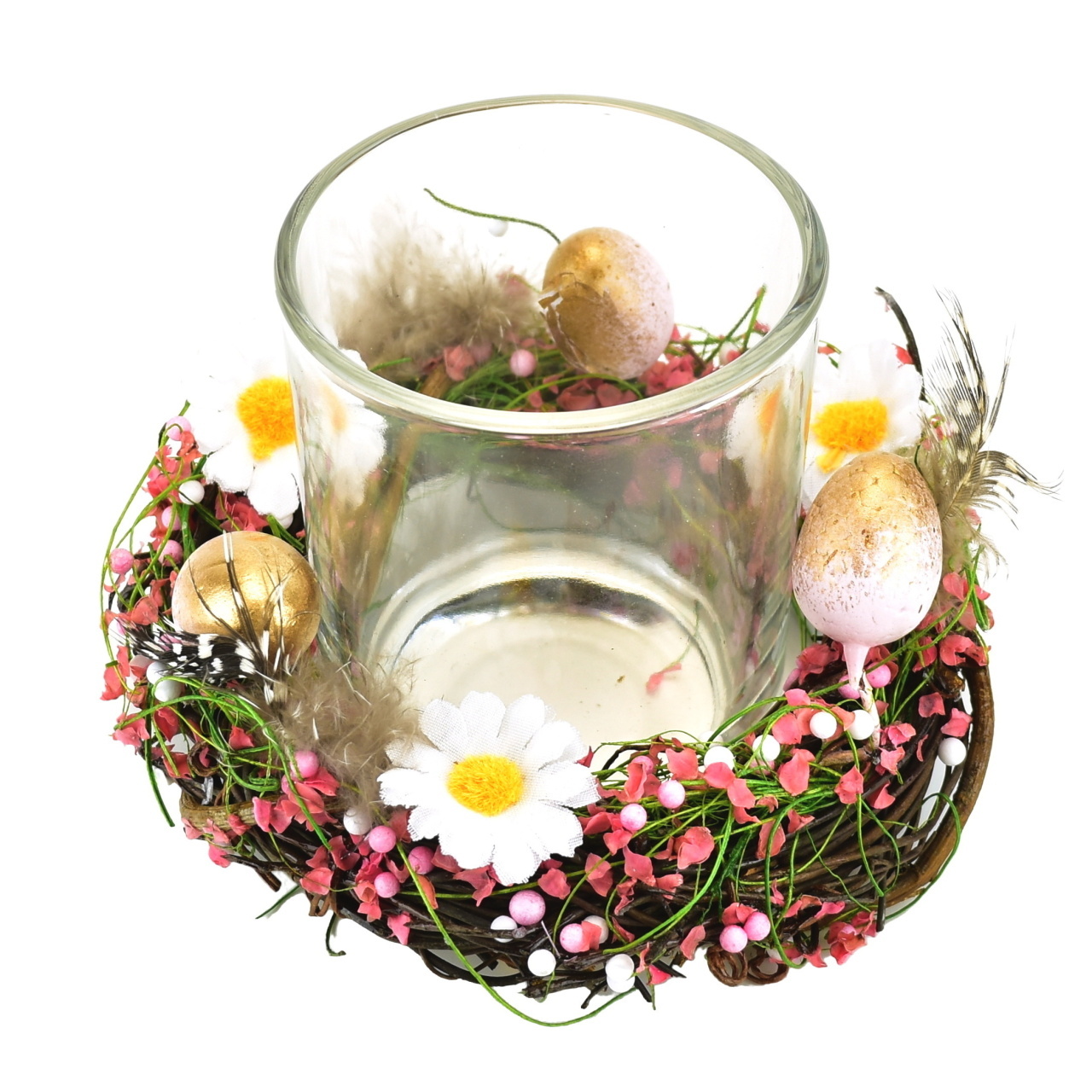 Jedinečný svícenek se zdobeným věnečkem je tím pravým pro vytvoření nezapomenutelné atmosféry ve vašem domove. Své hosty překvapte tímto ohnivým dekorativním prvkem, který zapadne do každého interiéru. Materiál: Sklo, proutí, textil, polystyrén, plast Design: Proutěný věneček zdobený...