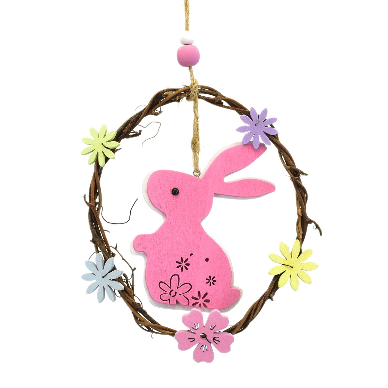Dřevěný růžový zajíček v proutěném okénku ve tvaru vajíčka s provázkem na zavěšení do okna nebo na dveře.Velikost: Výška 20 cm / Šířka 15 cm przeczytaj całość