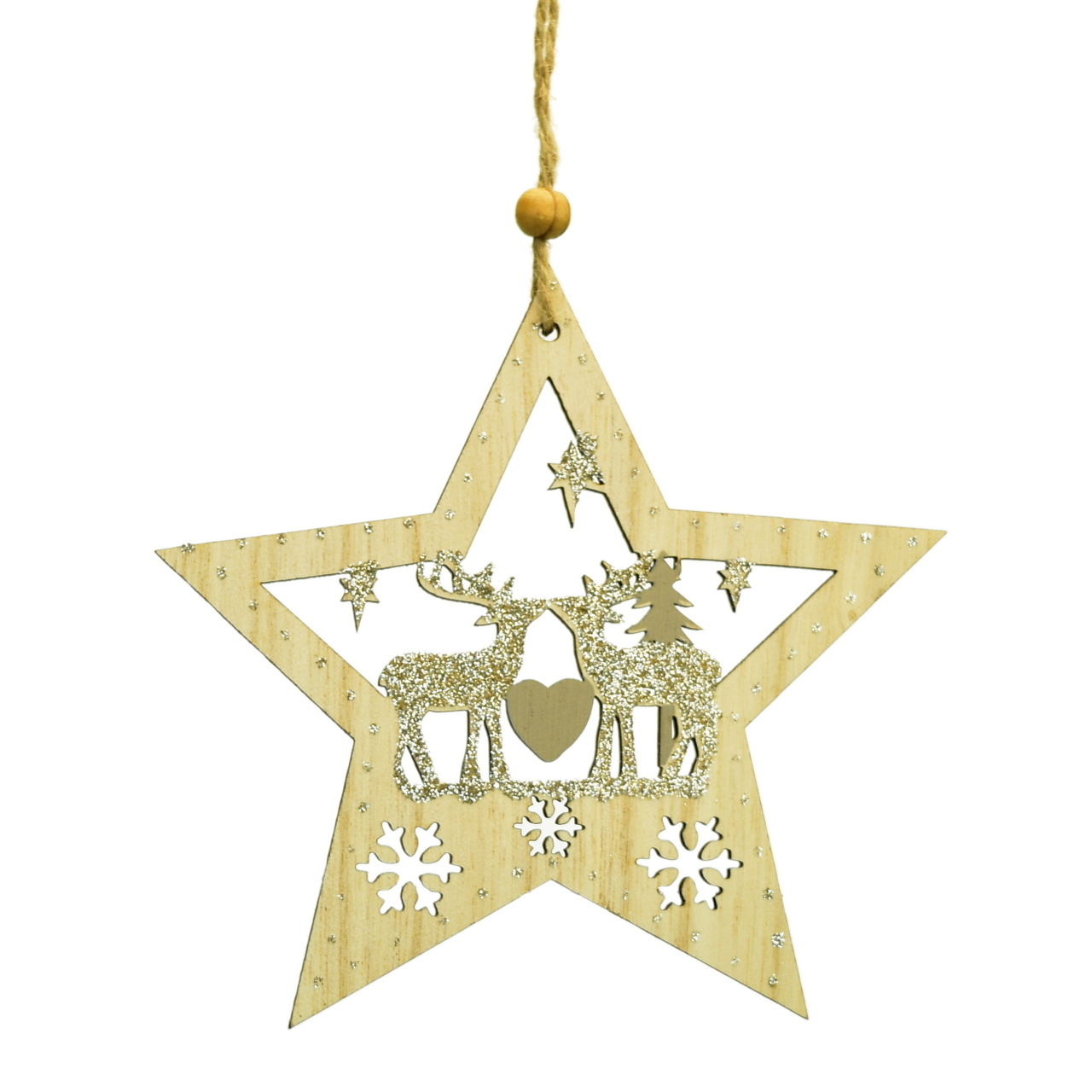 Závěsná hvězda se srnkami je perfektní vánoční ozdoba pro váš domov. Tato dřevěná hvězda s nádherným zlatým dekorem je vyřezávaná, což jí dodává jedinečný vzhled. S velikostí 14x14 cm a výškou 24 cm je dostatečně velká, aby přitáhla veškerou pozornost při zavěšení.Přidejte tuto krásnou ozdobu...