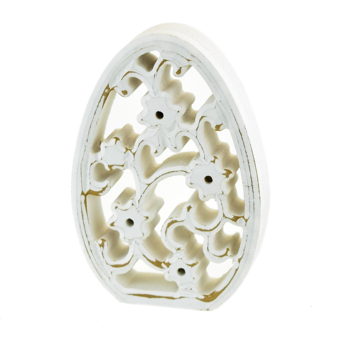 Velikonoční dřevěné vajíčko s perforovanou výplní kytiček v bílé barvě.Mareriál: překližka,  velikost: 12,5 x 8,5 cm (v. x š.) przeczytaj całość