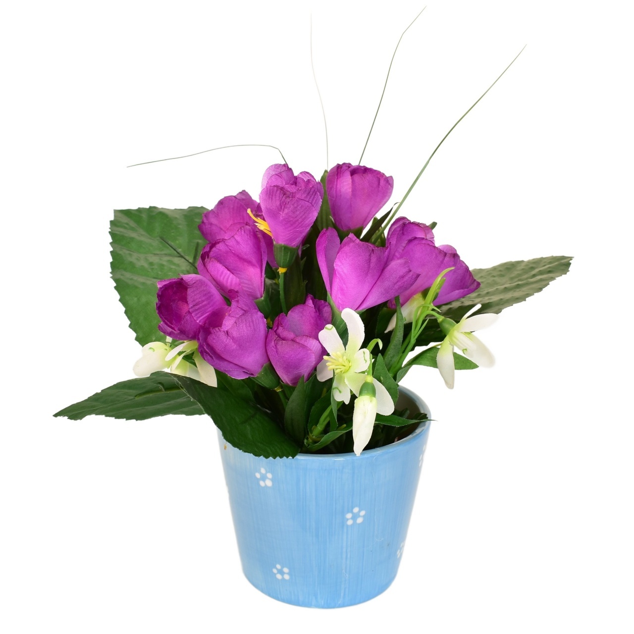 Obohaťte svůj domov o nádech elegance s naší umělou květinou Krokus s okouzlujícími fialovými květy. Umístěná ve stylovém světle modrém keramickém květináči dodá vašemu interiéru jemnost a půvab. Tento jedinečný vývazek, skládající se z 12 květů krokusů, vyniká nejen svou krása, ale také kvalitou...