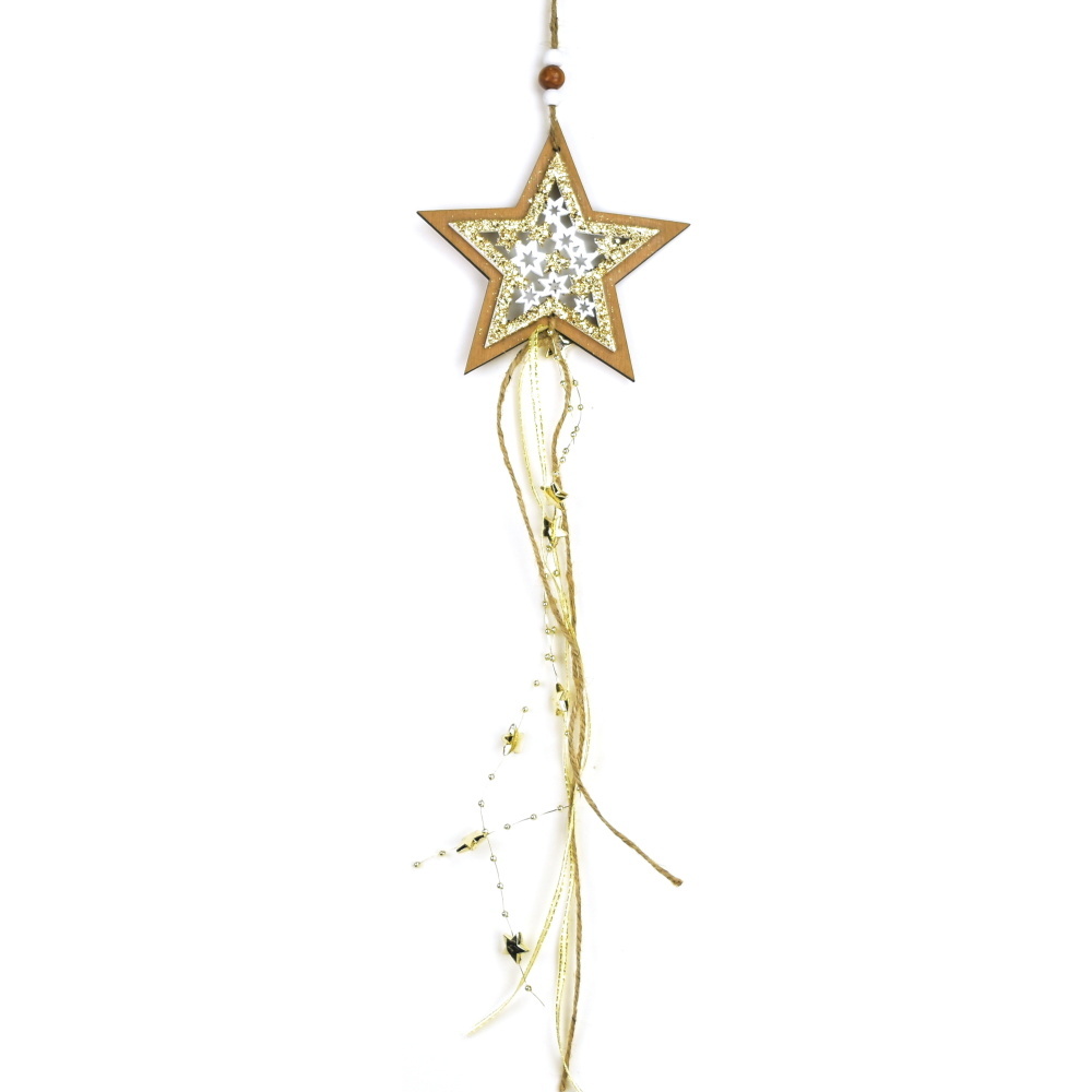 Dřevěná závěsná hvězda je krásným doplňkem pro vánoční atmosféru ve vašem domě. Je vyrobena z kvalitního dřeva a zdobená zlatým glitrem, který dodává hvězdě elegantní lesk. Svítící řetízek a mašle dodávají dekoraci ještě větší kouzlo.Tato hvězda má velikost 50 x 12 cm, což ji činí dostatečně...