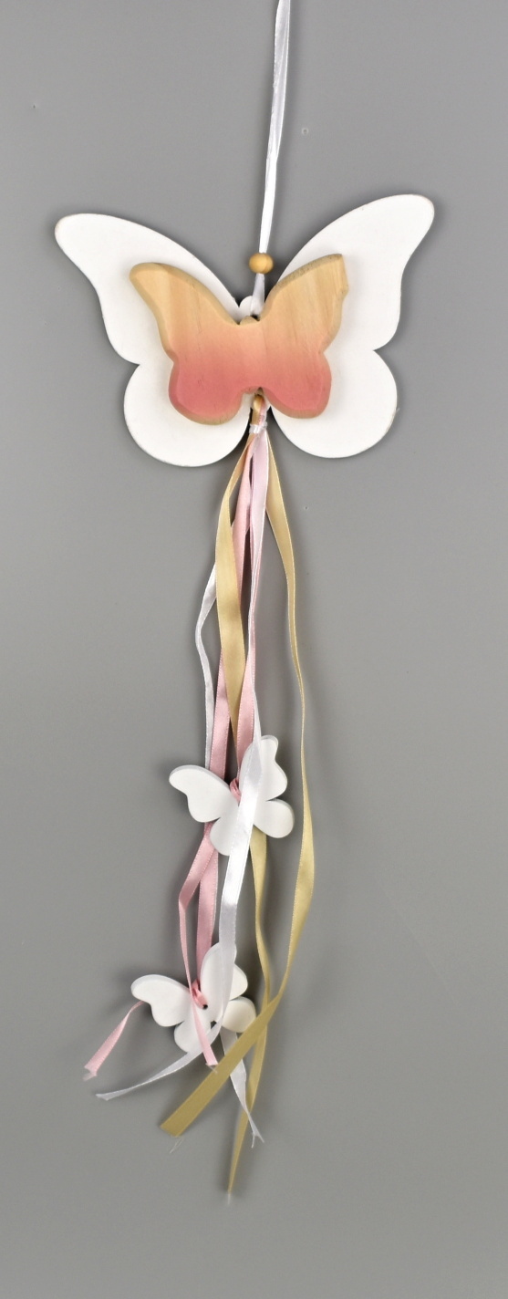Motýl dřevěný na zavěšení se stuhami. przeczytaj całość