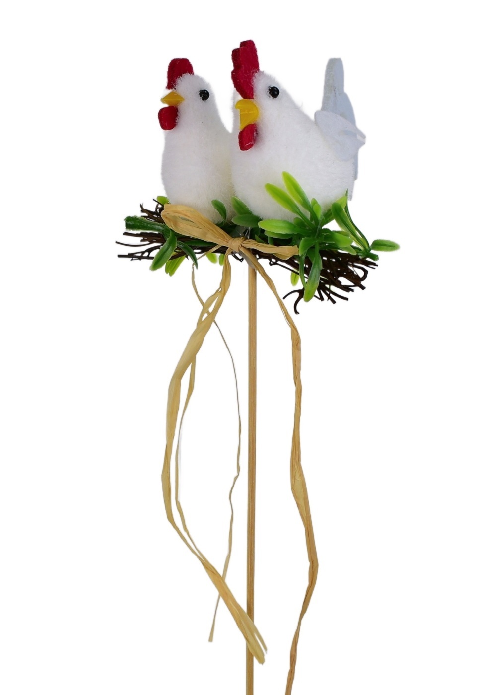 Slepička s kohoutkem na otýpce zápichOriginální velikonoční dekorace! Umístěte tuto roztomilou slepičku s kohoutkem na otýpce na vaše posezení a rozzářte svůj byt během svátků.Velikost: 35 cm včetně špejle, 6x10 cm zvířátek (v. x š.)Kvalitní lýková mašle: Slepička je zdobena okouzlující lýkovou...