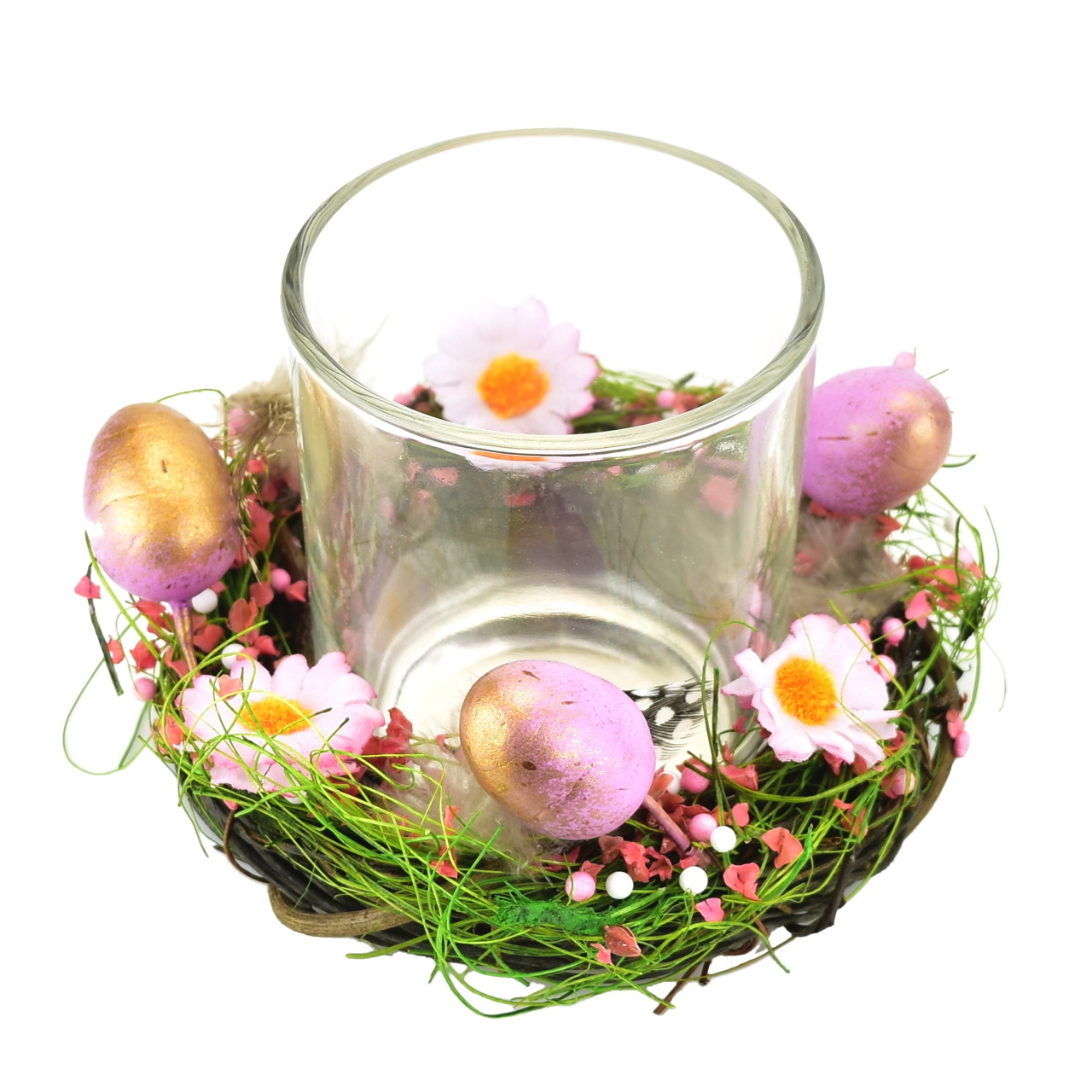 Oslněte svou domácnost tímto nádherným svícínkem se zdobeným věnečkem! S jeho půvabným designem a jemnými detaily se bude krásně vyjímat ve vaší oblíbené místnosti.Tento exkluzivní svícen je určen pro čajové svíčky a zdobí ho proutěný věneček se způsobenými vajíčky, peříčky, kytičkami a okvětními...