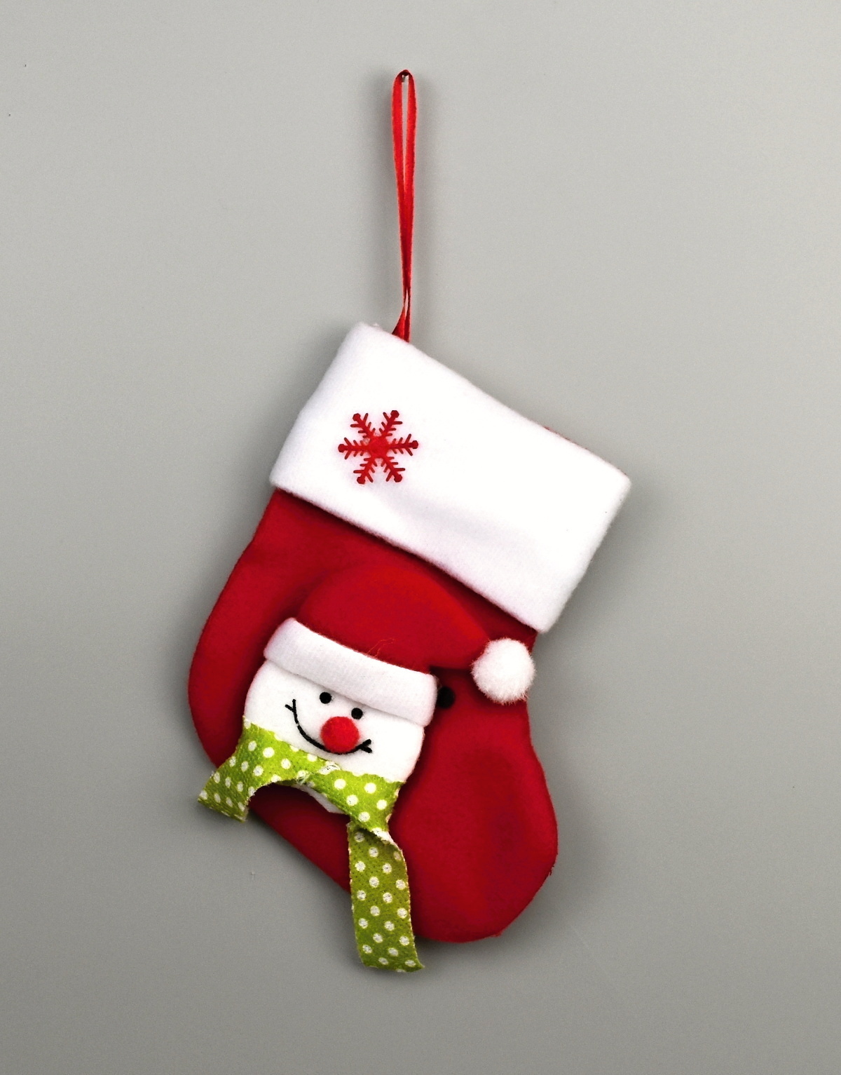 Vánoční dekorativní botička na zavěšení červeno-bílá s flísu s aplikací sněhuláka. przeczytaj całość