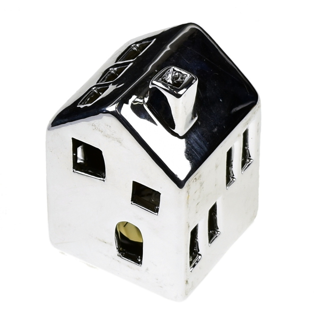 Keramický domeček stříbrný s LED osvětlením. Baterie je součástí výrobku.Výška 9,7 cm, šířka 6 cm. przeczytaj całość