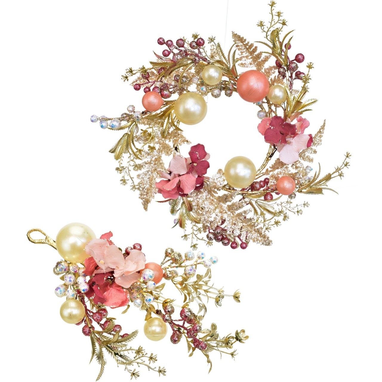 Věnec a větvička růžové s perleťovými kouličkami Ø35/32 cm