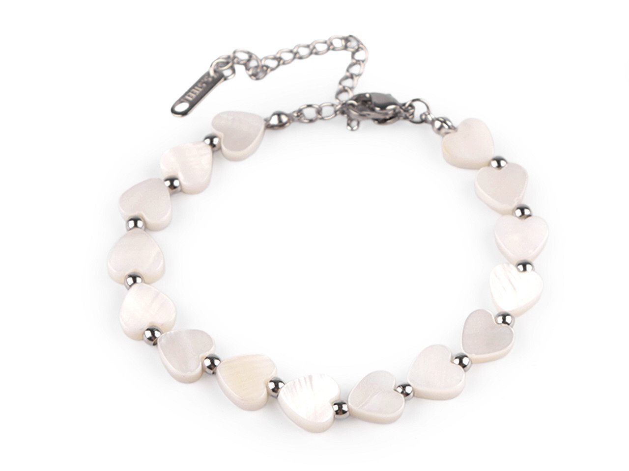 Perleťový náramek zaujme svou elegantní jednoduchostí a jemným designem. Je celý poskládaný z perleťových srdíček a nerezových korálků. Náramek má kvalitní zpracování, romanticky dozdobí vaše zápěstí. Bude krásným a stylovým dárkem nejen na Valentýna, díky univerzálnímu designu se hodí k různým stylům oblečení, bude skvělým dárkem pro někoho výjimečného.