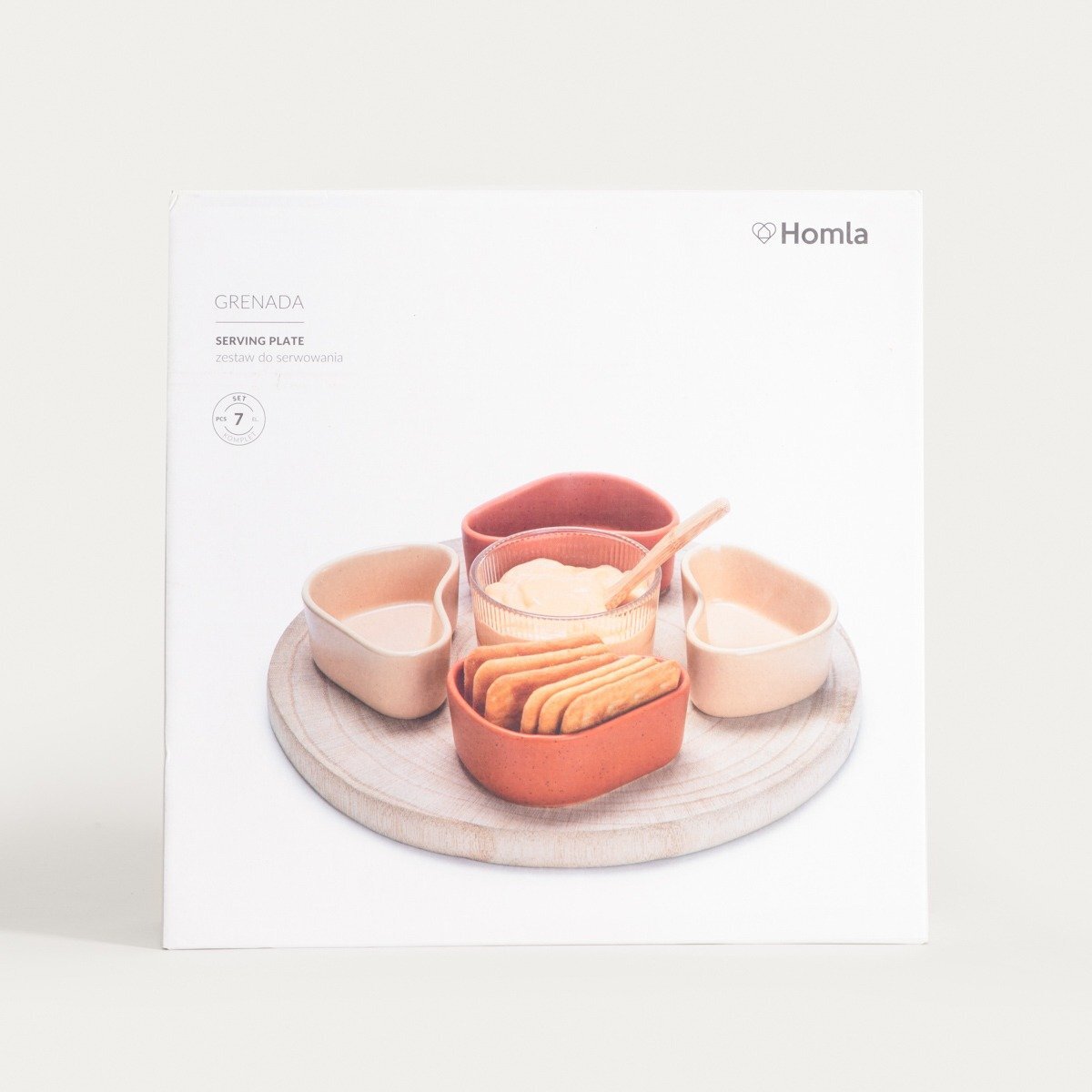 Ideální pro předkrmy, dipy a občerstvení. - 4 keramické misky v teplých zemitých tónech. - Masivní dřevěná podložka s přírodním povrchem. - Estetický a funkční doplněk na každý stůl.Servírovací sada – 7 kusůHledáte originální způsob, jak servírovat občerstvení? Sada GRENADA je stylovým a...