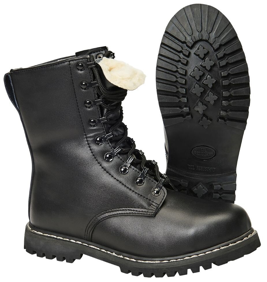 Kvalitní kopie výsadkářské obuvi používané výsadkáři německé armády Bundeswehr ve verzi s vnitřní zateplovací vložkou.Od německé značky Brandit.Vlastnosti:• opatřené ocelovou špičkou• pevná pryžová podrážka se vzorkem pro dobrou přilnavost při chůzi• materiál podrážky je odolný vůči oleji• úchyty šněrovadel umožňují rychlé zavazovaní i rozvazováníMateriál:svrchní: 100 % hovězí kůžepodřážka: guma