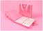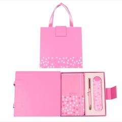 Zestaw prezentowy w ciekawym opakowaniu imitującym torebkę prezentową. Komplet zawiera notes z gumką i wstążką, długopis oraz etui skóropodobne na długopis. Zestaw upominkowy spakowany w kartonowe etui z zapięciem magnetycznym. Po zamknięciu opakowanie przybiera postać torebki prezentowej z uchwytami ze wstążki. Zatem po zakupie jest to gotowy prezent do wręczenia na różne okazje. Kolorystyka różowa.