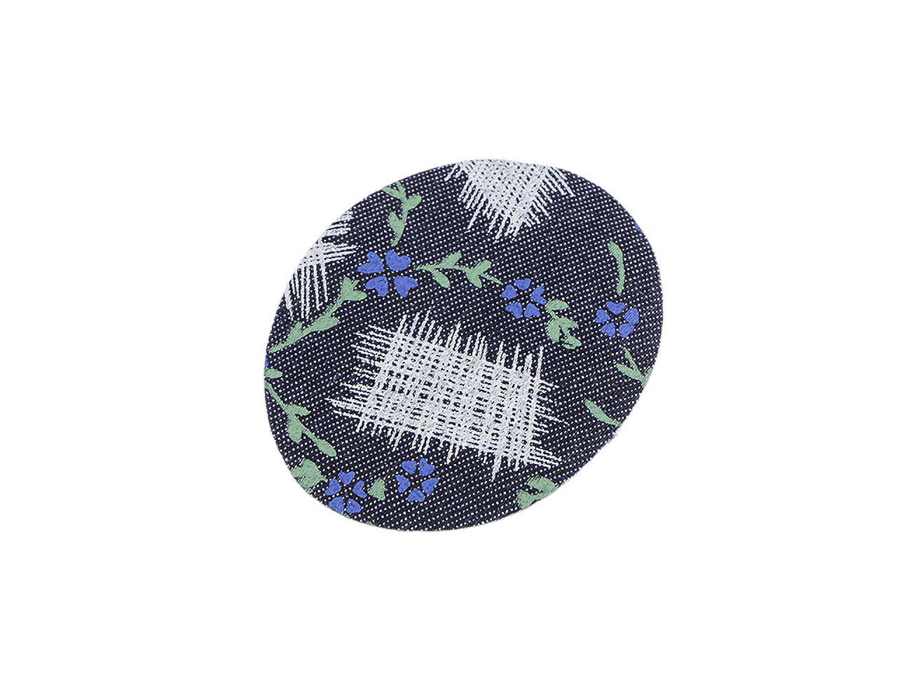 Nažehlovačka ve tvaru oválu vynikne jak na oblečení, tak na doplňcích jako jsou tašky, klobouky, batohy, kšiltovky apod. Má na sobě potisk záplaty a květů. Zakryje dírky a drobné nedostatky. Má ideální velikost k použití na malá dětská kolena či lokty.