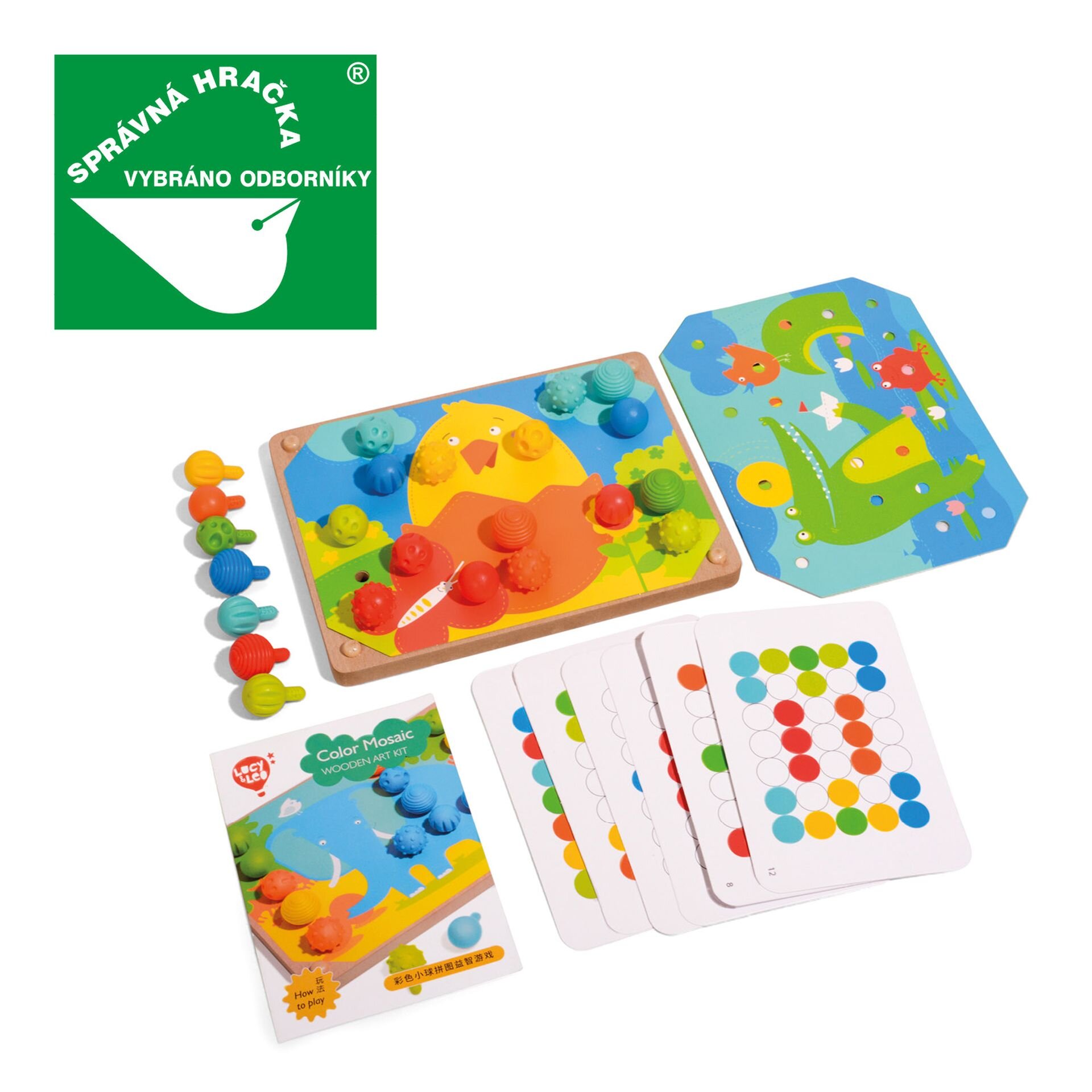 Mozaika a vyšívání je herní set pro děti rozvíjející jemnou motoriku a tvořivé myšlení. Balení obsahuje 35 velkých silikonových kolíčků s odlišně strukturovaným povrchem v 7 barvách. Dále obsahuje 12 barevných obrázků se zvířátky a 6 oboustranných předloh, dřevěný podstavec s otvory na kolíčky a...