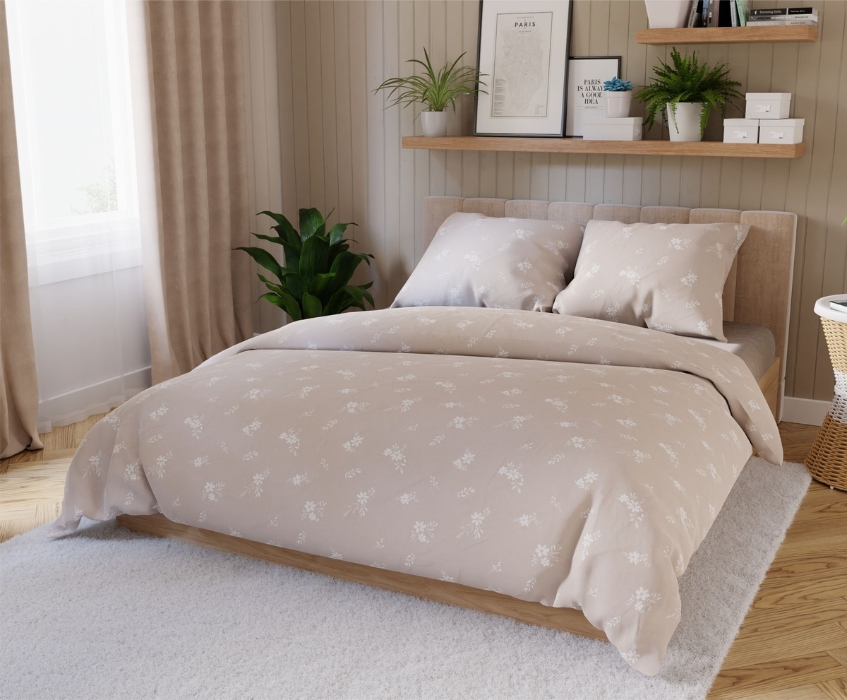 Nechte se unášet přírodní krásou. Vzor drobných bílých květin na uklidňujícím béžovém podkladu vytváří harmonickou a vyváženou atmosféru. Je to ideální volba pro ty, kteří chtějí do svého domova vnést jemný, přírodní a útulný nádech. Speciální úprava materiálu z česané bavlny se stará o to, že je...