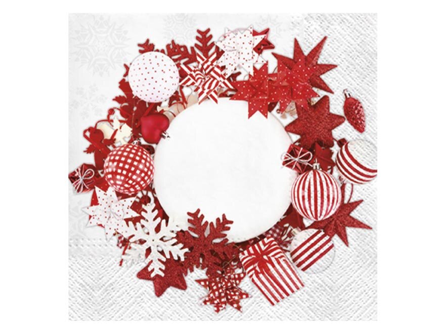 Vánoční ubrousek s vánočním věncem z ozdobOriginální vánoční ubrousek s motivem červeného věnce poskládaného z hvězd, sněhových vloček, baněk a dárků krásně doladí svátečně prostřený stůl. Kombinace tradiční červené a bílé barvy navodí veselou atmosféru a rozzáří každou tabuli.Třívrstvý papír...