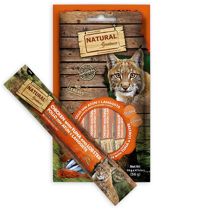 doplňkové krmivo pro kočky - pamlsek vhodné od 2 měsíců věku hypoalergenní krémová měkká pochoutka bez obilovin z kuřecího masa, tuňáka a humra nejvyšší kvality obohacená o extrakt z tuňáka, taurin obsahuje L-lysin, esenciální aminokyselinu, která podporuje správné fungování imunitního systému...
