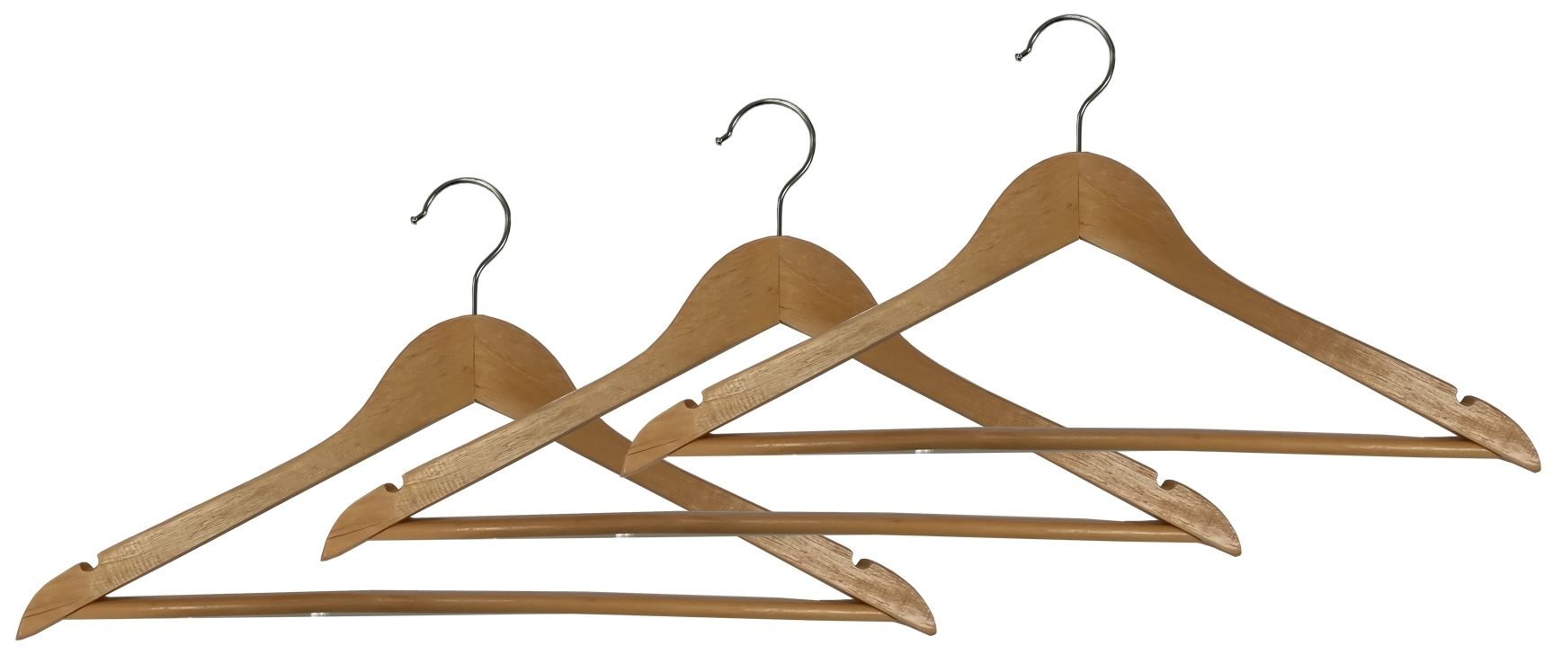 Sada 3 ks dřevěných ramínek Compactor z přírodního dřeva se zářezy a tyčkou, šířka 44,5 cm