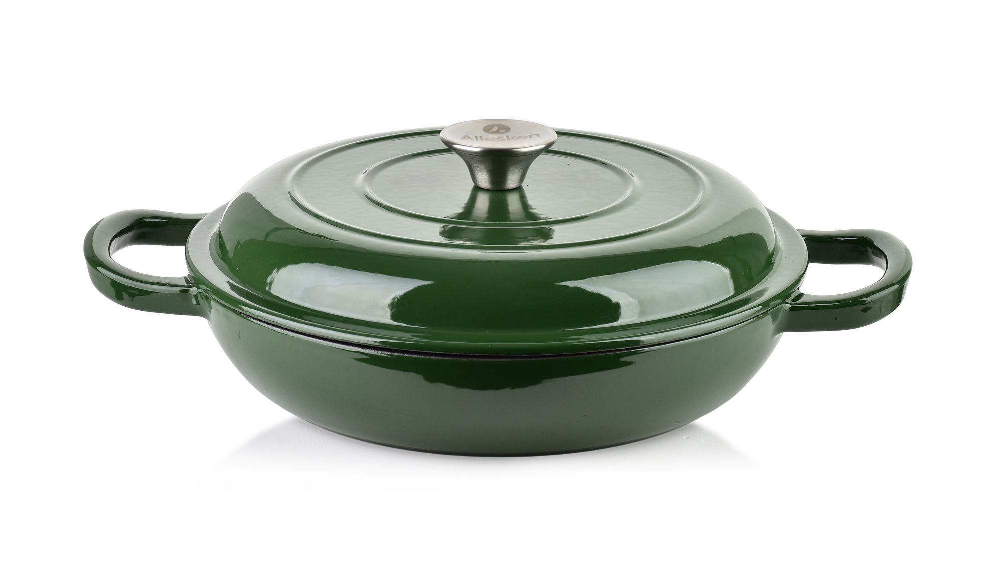Gęsiarka żeliwna w kolorze zielonym z serii VERDELUXE to wysokiej jakości naczynie kuchenne, które jest idealne do przygotowywania różnorodnych potraw, w szczególności duszonych mięs, zapiekanek oraz pieczeni. Oto kilka cech charakterystycznych takiej gęsiarki:...