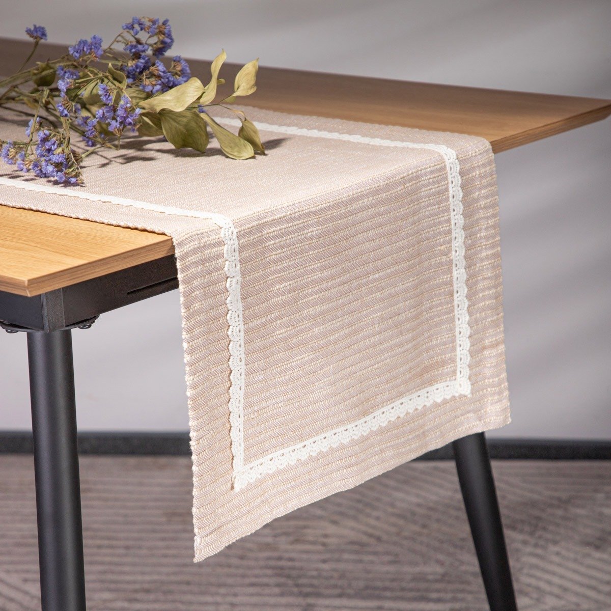 Bieżnik | ANIZA  | beżowy z białą koronką | 40x160 cm | 735097