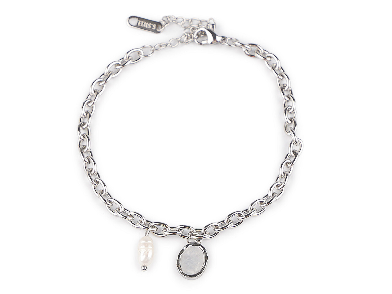 Řetízkový náramek ozdobený perleťovým přívěskem a říční perlou. Přívěsky jsou k náramku pevně přichycené, po náramku se nepohybují. Náramek je vyrobený z kvalitní nerezové oceli ve vysokém lesku. Romanticky dozdobí vaše zápěstí, hodí se k nošení na každý den i ke slavnostním příležitostem.