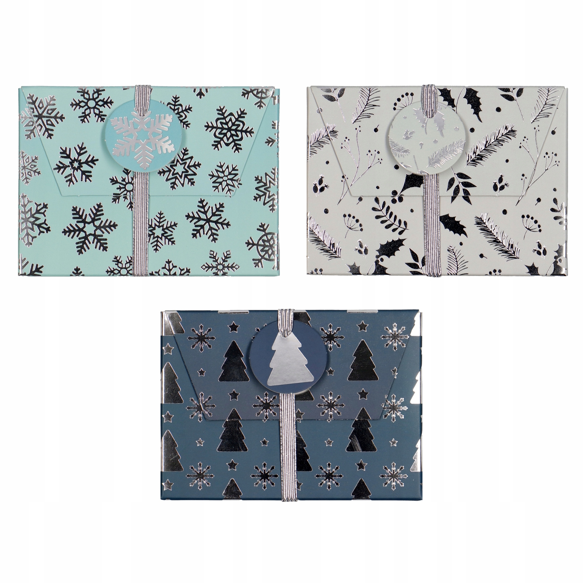 Pudełka na karty podarunkowe gotówkę 3 sztuki pudełeczka sztywne, wykonane z kartonu elegancki wzór świąteczny zdobienie wykończone hot-stampingiem – folią metaliczną świetny sposób na ofiarowanie gotówki, karty podarunkowej lub wszelkiego rodzaju voucherów 3 sztuki w zestawie... przeczytaj całość