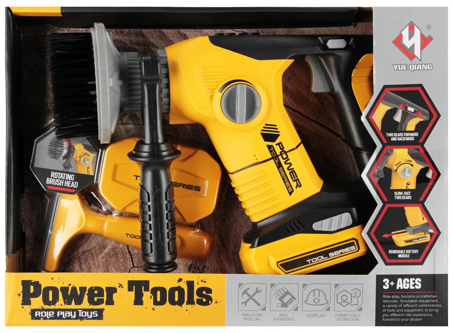 Zalety produktu: rozwijanie wyobraźni, nauka używania narzędzi warsztatowych, rozwijanie zdolności manualnych, rozwijanie w dziecku pasji, szlifierka posiada obrotową głowicę ze szczotką która kręcąc się szlifuje nawierzchnie, uruchamiana za pomocą odpowiedniego przycisku, posiada efekt świetlny....