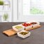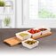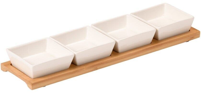 Servírovací misky s tácem, bambus KESPER Elegantní servírovací sada s miskami a podnosem z bambusu je ideální pro stylové podávání omáček, dipů či drobného občerstvení. Tác je vyroben z FSC® certifikovaného bambusu, což zajišťuje ekologický původ materiálu. Porcelánové misky se snadno udržují a...