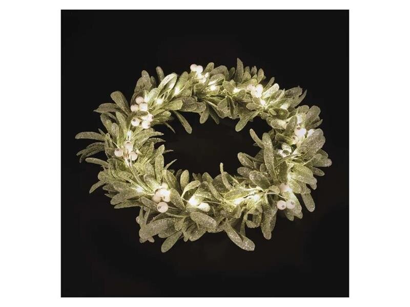 LED dekorace - věnec jmelíTechnické parametry:produkt: věnecbarva světla: teplá bílápoužití: vnitřnírozměr: 35 cmčasovač: anodálkový ovladač: netyp napájení: baterie 3× AA (není součástí balení)zdroj svícení: LEDpočet LED: 25délka přívodu: 25 cmbarva drátu: transparentnípříkon: 0,2...