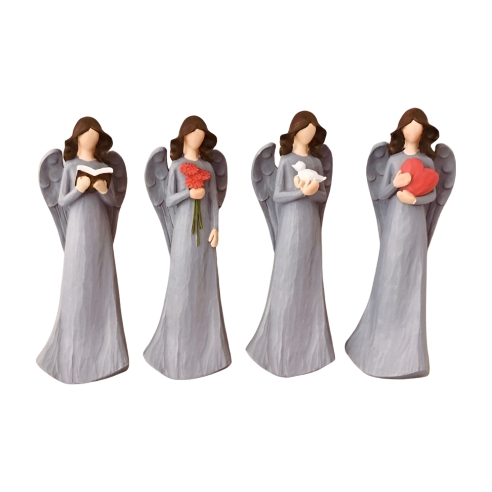 Anděl Pruel s květinou, srdíčkem, holubící a knihou.Materiál: polyresinRozměr:výška 20 cmBarva: šedámix druhů przeczytaj całość