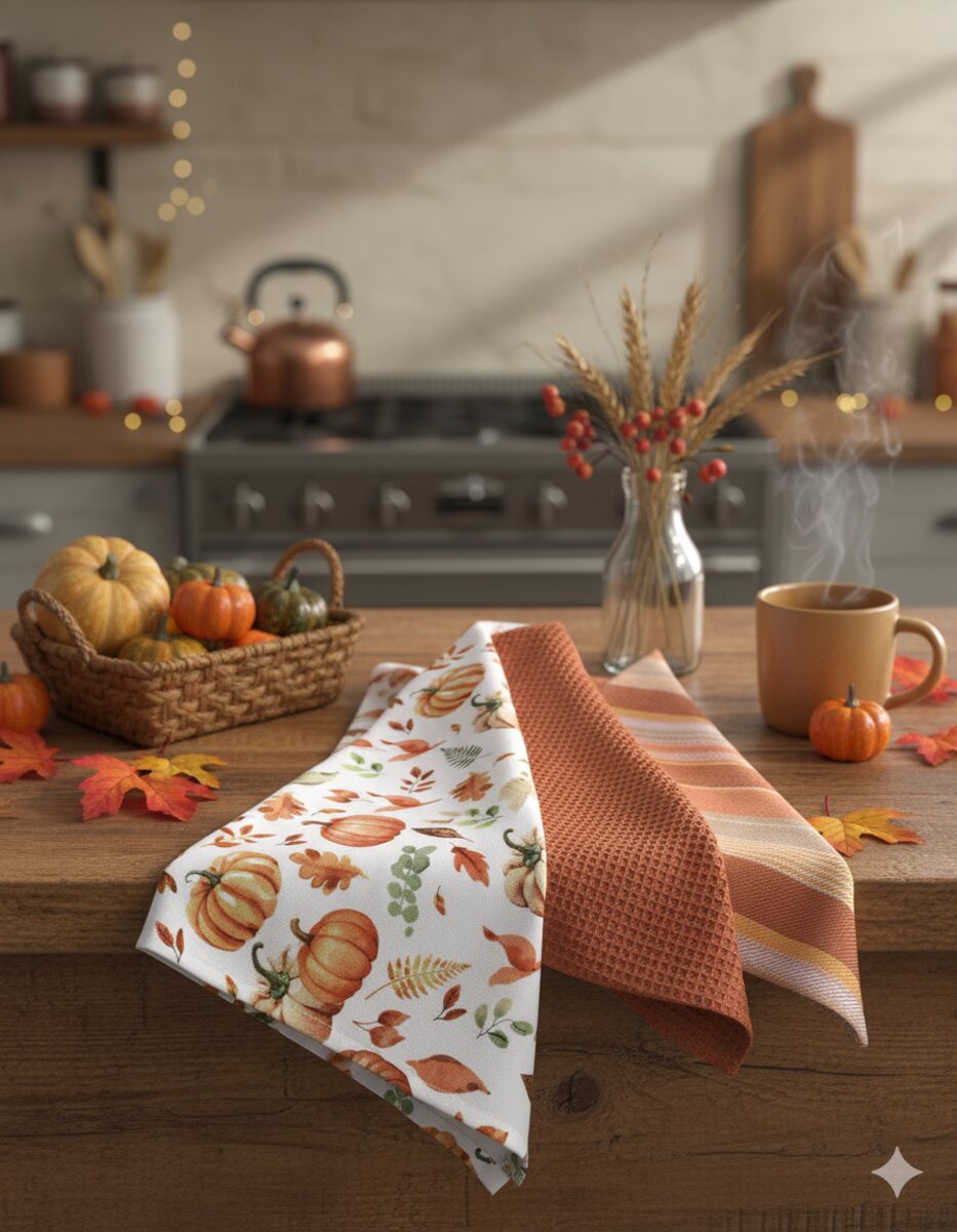 Tato sada tří kuchyňských utěrek je ideální pro podzimní sezónu.Sada obsahuje:Utěrka s potiskem: Utěrka s bílým podkladem, zdobená podzimním motivem. Najdete na ní realistické vyobrazení dýní v různých velikostech, hnědých a oranžových listů (dubové a jiné podzimní) a zelené listové dekorace,...